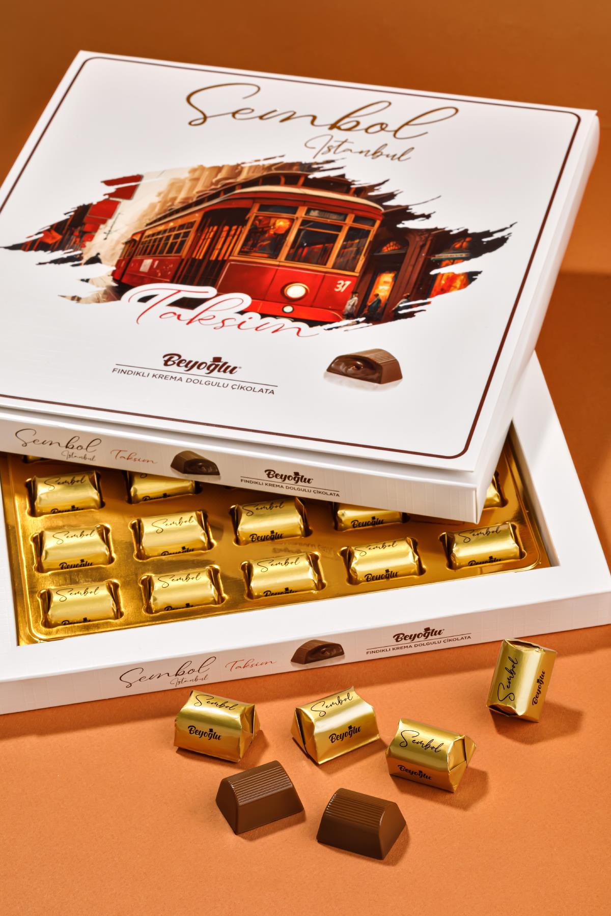 Fındıklı Krema Dolgulu: Beyoğlu sembol hediyelik çikolata, zengin fındıklı krema dolgusu ile her lokmada enfes bir tat sunar. Fındık ve kremanın mükemmel uyumu, çikolatayı daha da özel kılar.